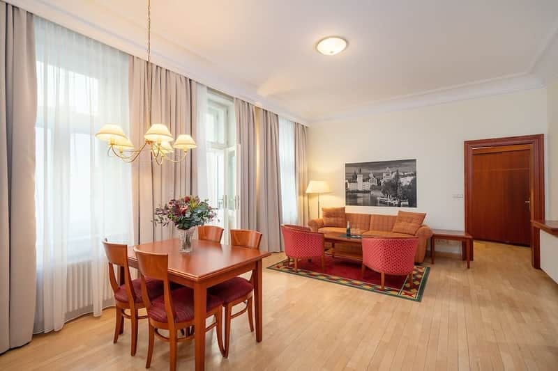 A centrally placed hotel in Prague offering practical guestrooms with kitchenettes, connected living spaces, and convenient access to major sights.